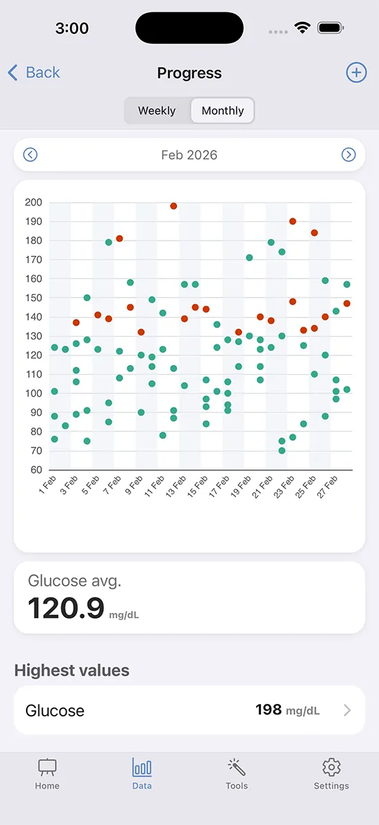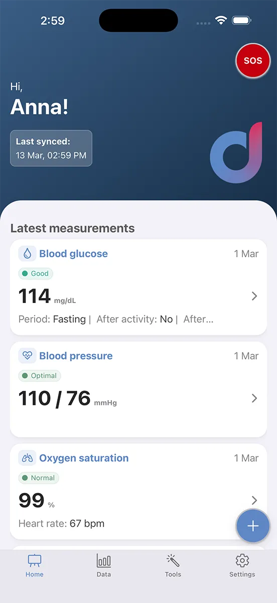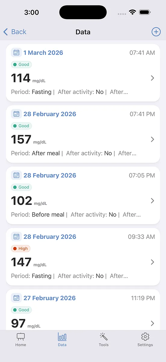Pair your Bluetooth glucometer or connect Apple Health / Google Health Connect for automatic data syncing.